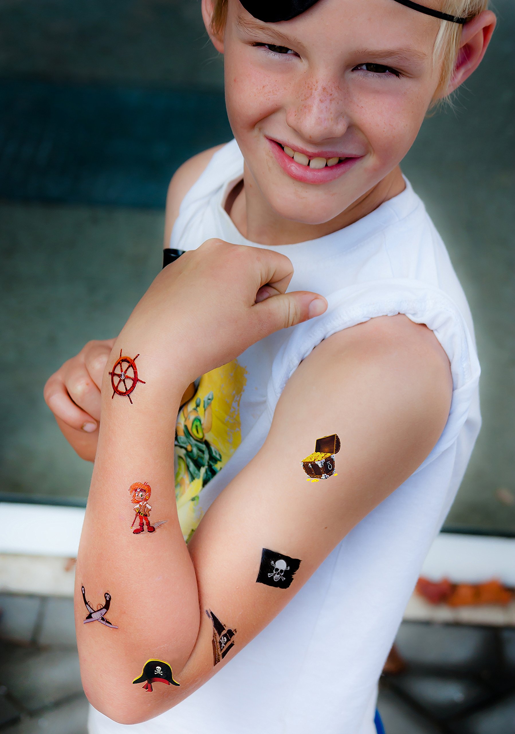 Oblique Unique Piraten Tattoo Set 24 Kindertattoos Verschiedene Piraten Motive Kinder Spielen Amazon De Spielzeug
